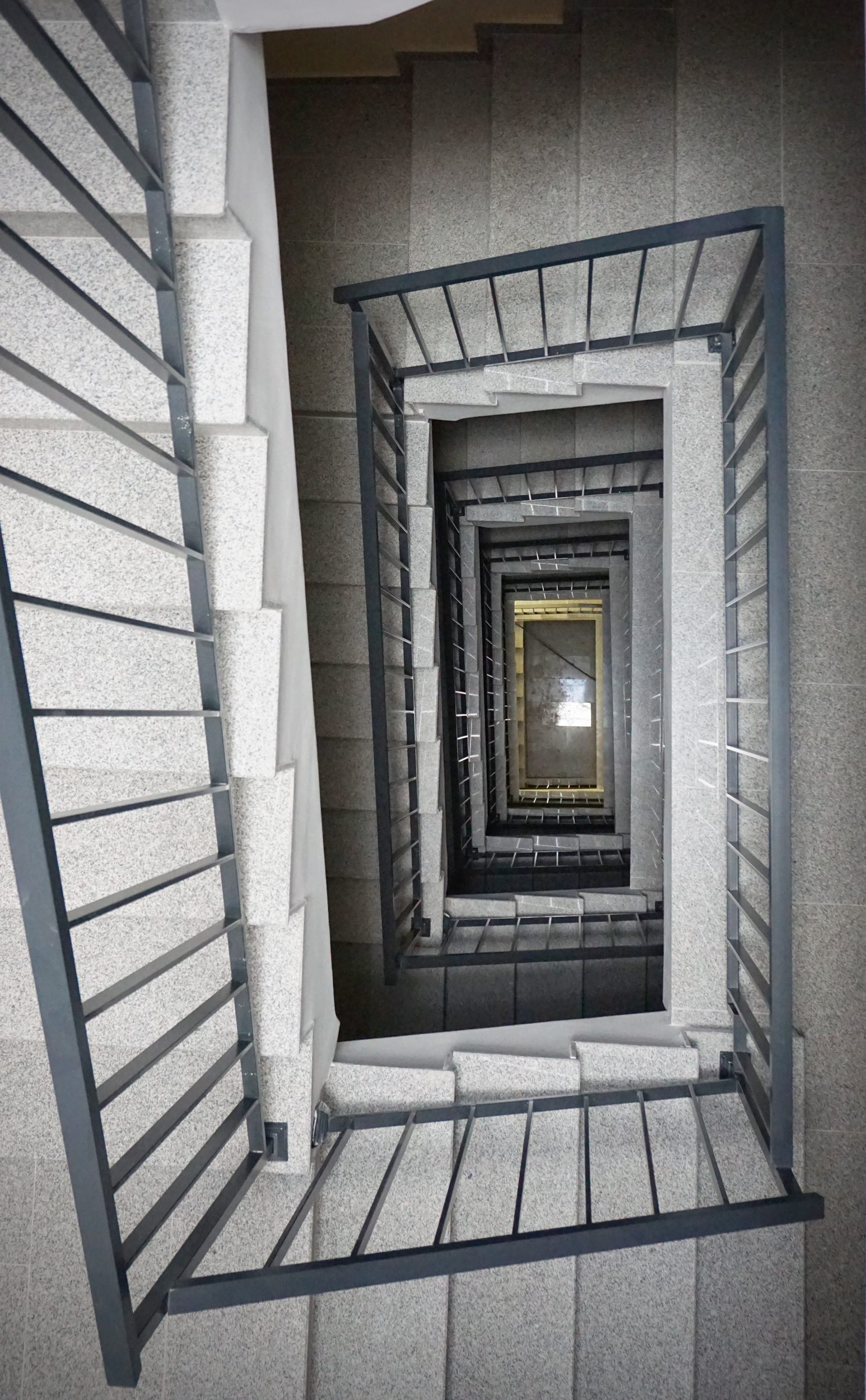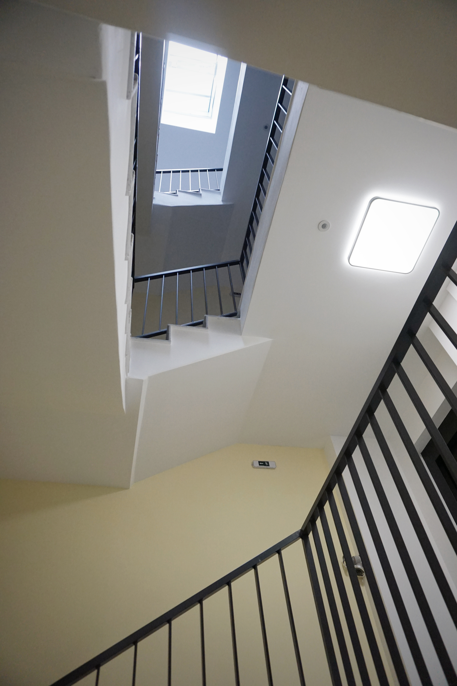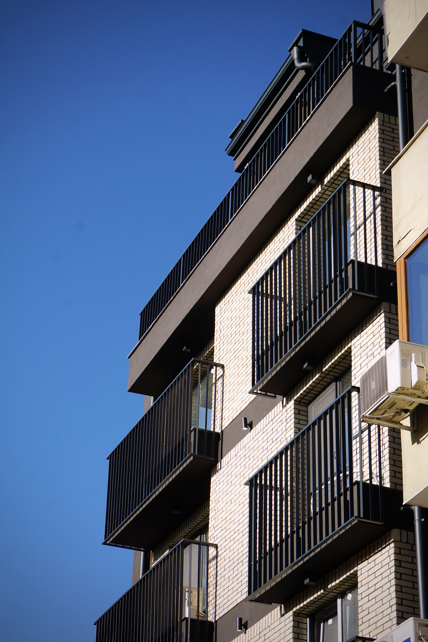 The building features a restrained palette of light sandy brick and contrasting dark metal elements. Upper levels are clad in brick with strips of dark render, while the dark metal roof complements the granite footing wall at street level. Dark metal balcony railings define the exterior and are echoed in the interior atrium staircase balustrade. The interior lighting scheme was designed using Studio K’s multi-agent method incorporating AI tools.