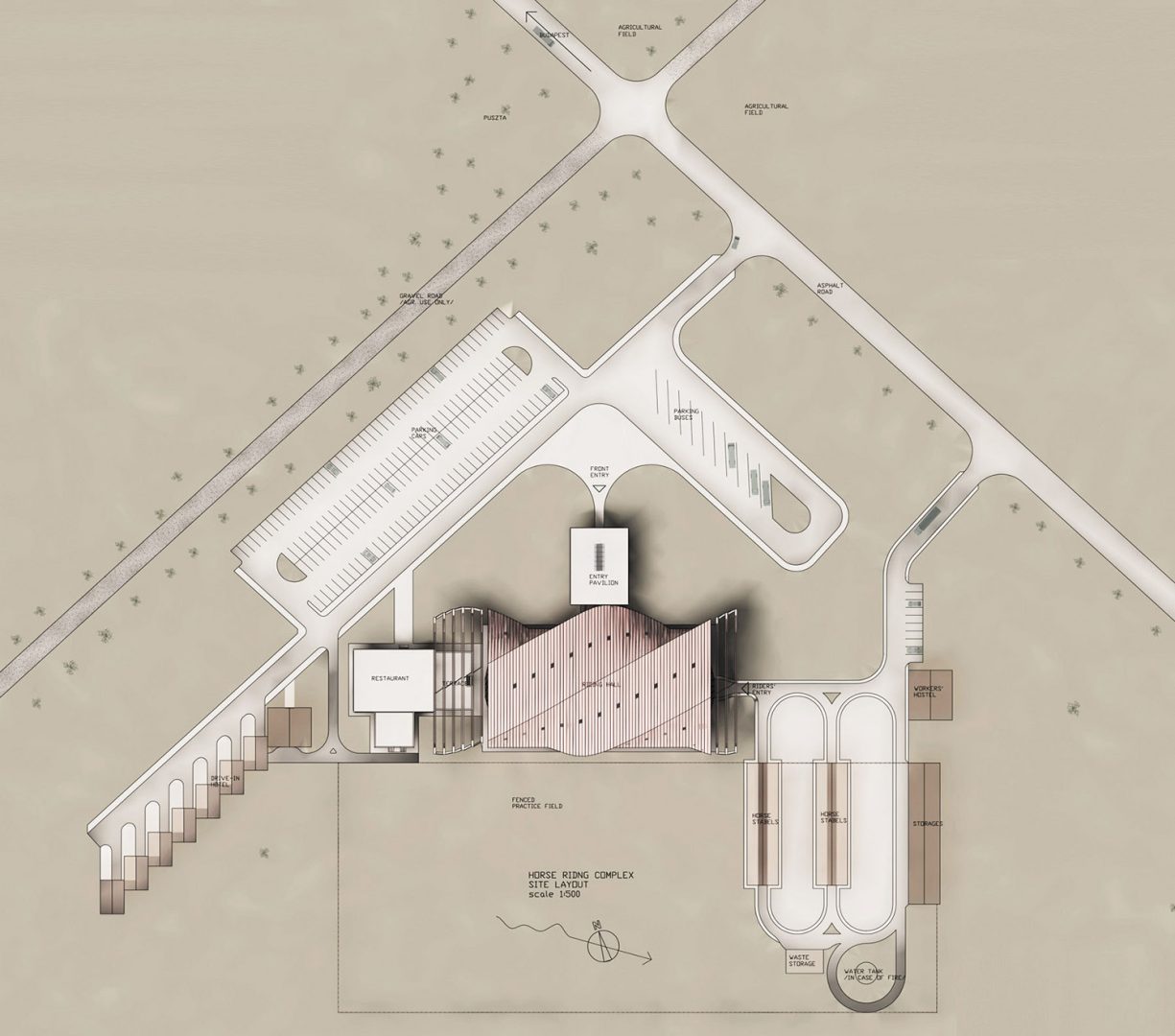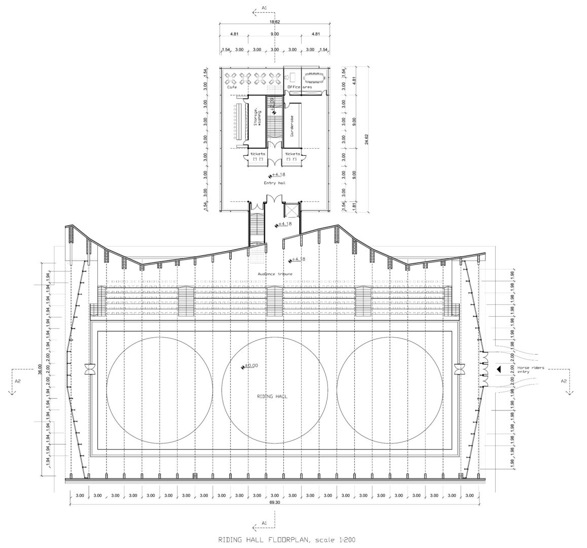 Puszta Sports Hall, a rural retreat near Budapest, includes a multifunctional sports hall, stables, bungalows, and a restaurant. The main hall’s sculptural, copper-clad form is framed by a glulam timber structure. Two minimalist glass pavilions lightly adjoin this dynamic volume, accommodating the restaurant and front-of-house spaces.