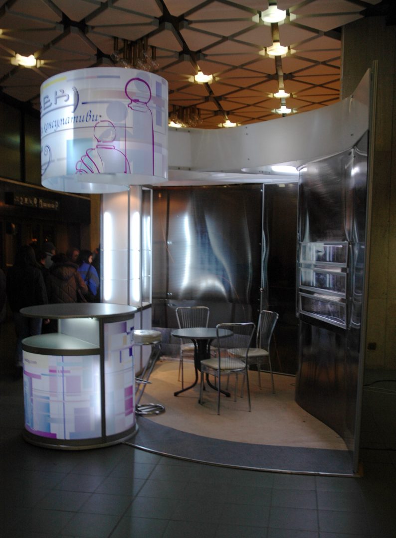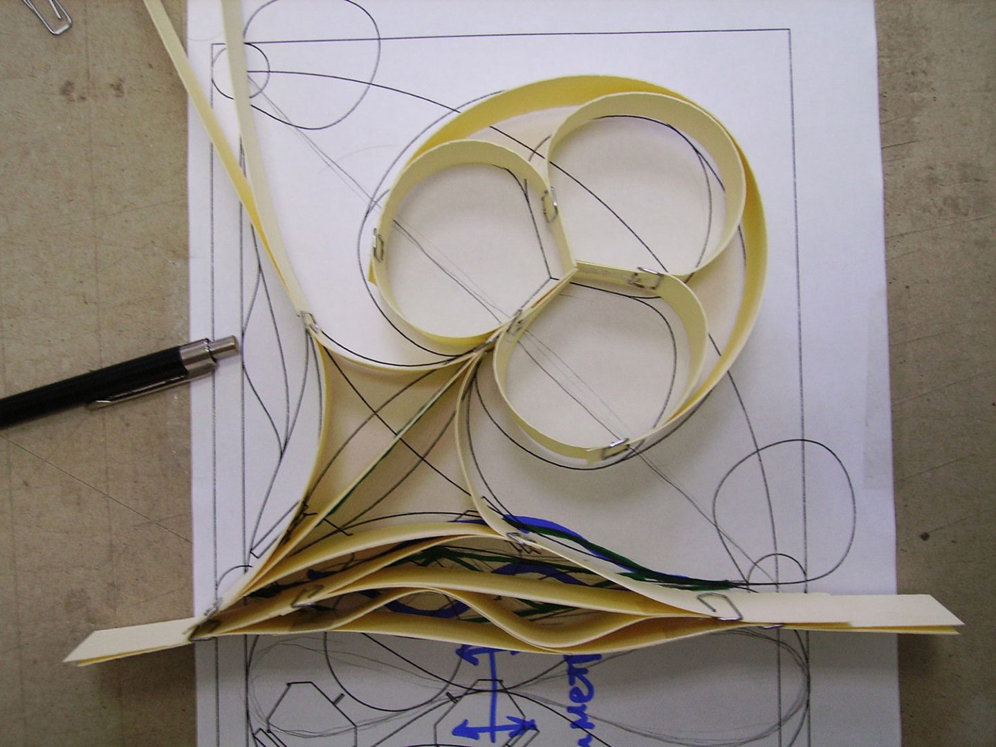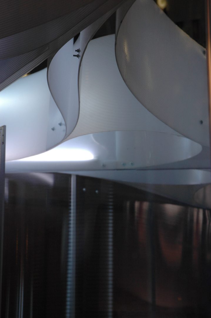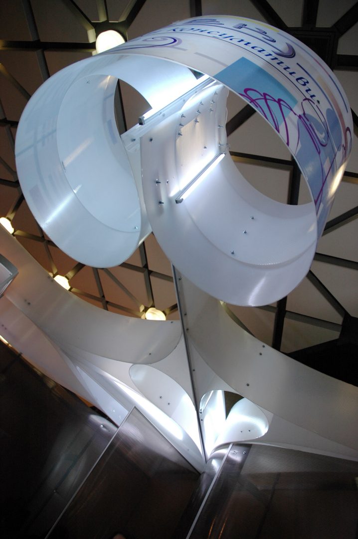 This exhibition stand is an exploration of the potential of soft materials to become structural. Polycarbonate sheets—typically used as a lightweight, shatter-resistant alternative to glass—are reimagined as load-bearing elements. Curved and layered, the sheets gain rigidity and resist buckling, allowing the material’s inherent strength to define structural formations. The result is an ephemeral installation where graceful curves and soft light embody the sensuality cosmetic products of the brand it represents.